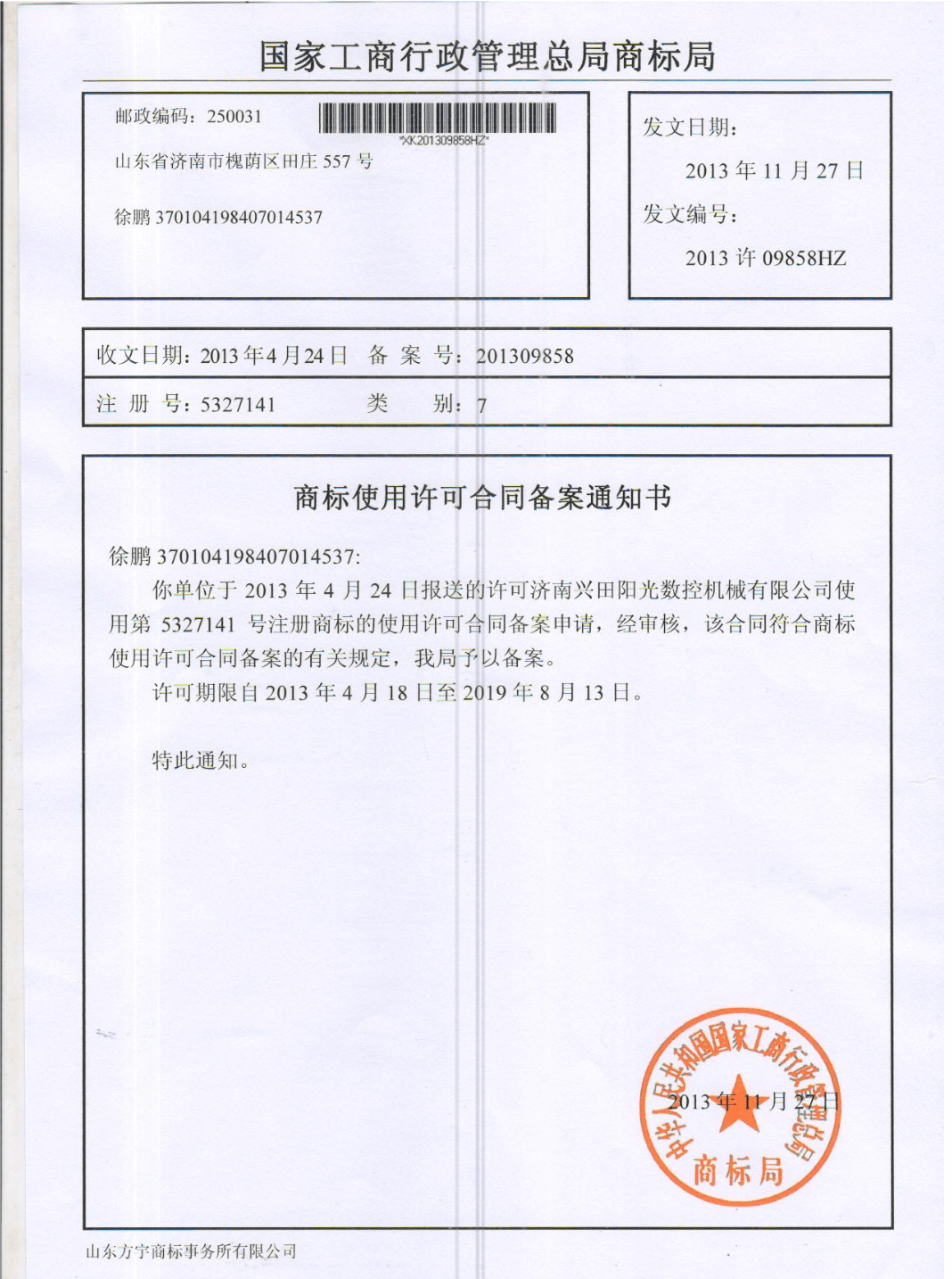 商標使用許可合同備案通知書